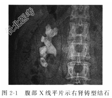 辅助检查 B超检查示右肾结石并右肾局限性积水声像;腹部X线平片(KUB)示右肾局部呈现高密度钙化影,呈铸型,纵径4.8cm,横径1.9cm(图2-1);尿液常规未见红细胞、白细胞、脓细胞,大便隐血试验(+)。