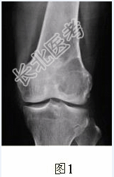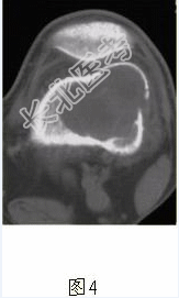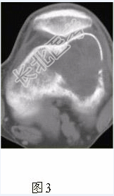 - [材料题] 患者女,35岁,左膝关节隐痛1年余,近1周加重,活动后明显疼痛。查体:左股骨下端外侧肿胀,压痛。行左膝关节正侧位CR,并行左膝关节CT扫描,见下图。