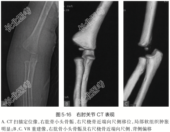 - [材料题] 患者,男性,15个月。右肘关节创伤后肿胀伴活动消失6小时余。外院X线片报告:右肘关节诸骨未见明显骨折征象,未见明显脱位。影像学检查: