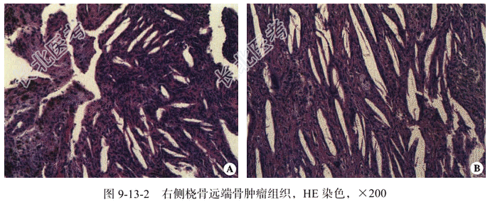 【手术所见】逐层切开皮肤、皮下组织及深筋膜后,可见灰白色病变组织,予以切除,并取肿瘤后送快速冰冻病理检查。 【病理所见】右侧桡骨远端骨质破坏,被灰白色肉芽组织占据(图9-13-2)。免疫组化结果:CD1a(-),Langer(-),S-100(-),CD68(+),CK(混-),Ki-67(25%+),P63(部分+),CD163(+)。