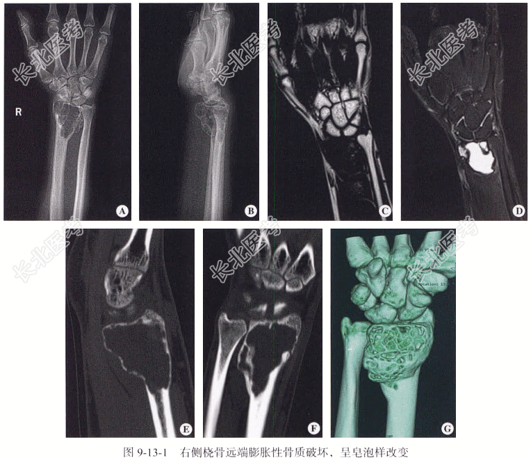 【影像所见】DR平片上右侧桡骨远端偏心性横向生长、轻度膨胀性骨质破坏,其内可见纤细骨嵴,构成分房状、皂泡样改变,骨壳变薄,其轮廓完整。