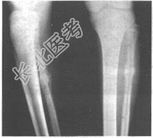 - [材料题] 患者,男,17岁。因左下肢疼痛2个月入院,查体:左小腿中段局部肿胀,组织增厚较硬,有压痛,局部皮温稍高。体温38.2℃,实验室检查:WBC:13.8×10¹²/L,N:78%;X线平片见下图。