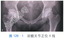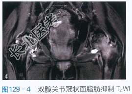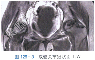 读片分析:如图129-1双髋关节正位X线片、图129-2双髋关节蛙位X线片所示,右侧股骨头形态变扁,内见斑片状骨质硬化及透亮区。左侧股骨头形态正常,见类圆形透亮区,周围环形骨质硬化。 如图129-3双髋关节冠状面T₁WI、图129-4双髋关节冠状面脂肪抑制T₂WI图像所示,右侧股骨头形态变扁,双侧股骨头T₁WI上可见典型的“双线征”,即病灶内缘为高信号,外缘为低信号。双侧股骨头弥漫性骨髓水肿。结合病史,患者诊断为双侧股骨头缺血坏死。