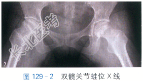 (2)体格检查:双髋关节压痛、活动受限、跛行、“4字”试验阳性。