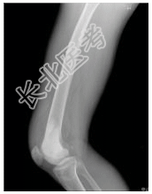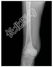 - [材料题] 患者男,21岁,右股骨下端肿痛2月余。查体:右股骨下端压痛,肿胀,可触及软组织肿块。行股骨下段正侧位片检查。