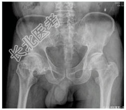 - [材料题] 患者男,53岁,右髋痛10余年,有酗酒史。查体:右髋压痛明显,4字试验阳性。行骨盆平片检查。