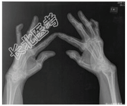 - [材料题] 患者女,55岁,全身多处关节肿痛30余年。查体:双手关节多处变形,晨僵,类风湿因子阳性。行双手正斜位片检查。
