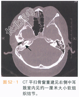 患者,女性,42岁,右耳听力逐步下降2年,近来加重伴右侧面瘫而来院检查。自诉既往无明显不适,否认慢性中耳炎病史。