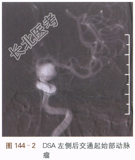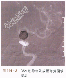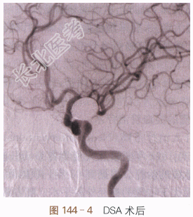 经血管动脉瘤腔弹簧圈填塞术:①术前DSA如图144-1所示;②DSA路图示微导管到位(见图144-2);③DSA路图示动脉瘤腔内盘曲的弹簧圈(见图144-3);④术后DSA(见图144-4)。