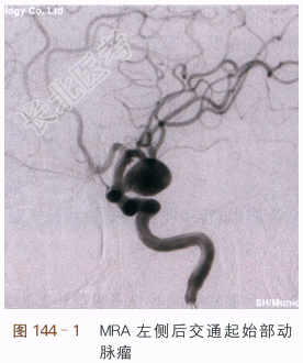 三、诊治经过 CT扫描显示蛛网膜下腔出血,MRA和DSA显示左侧后交通起始部动脉瘤,符合动脉瘤破裂导致蛛网膜下腔出血。逐行全麻下右侧股动脉穿刺插管,选择性插管入左右颈内动脉和椎动脉造影,测量动脉瘤0.8×0.9cm²大小,并评估脑内血流动力学情况。取动脉瘤和载瘤动脉关系显示最佳位置。①在肝素化后,置导引导管入患侧颈内动脉C₂段,然后在微导丝导引下置放导管头入动脉瘤腔并撤除微导丝。②再从大到小逐一置入不等大小弹簧圈共11枚(15×500mm,14×340mm×2,13×430mm,13×320mm,10×250mm,3×80mm,2×60mm,1×20mm,1×10mm)。③术后造影显示动脉瘤完全致密闭塞,载瘤动脉通畅。④逐拔管,股动脉缝合止血。复苏后返病房。采用抗血管痉挛治疗2周,腰穿放血性脑脊液2次。
