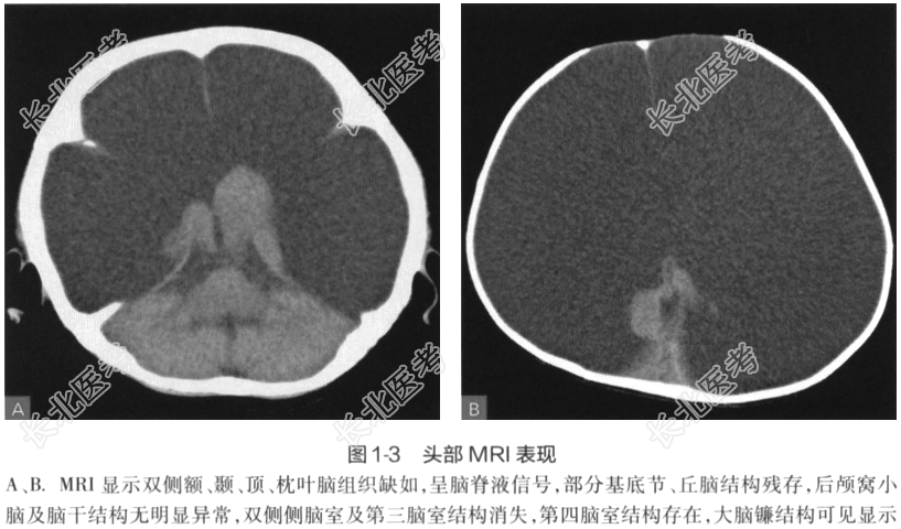 - [材料题] 患者,玄性,5个月。头围渐进性增大,精神、运动发育迟缓,烦躁、易激惹,间断性抽搐发作。查体见前囟增大、膨隆,肌张力增高,吸吮反射减低,颅骨透光试验阳性。影像学检查: