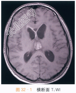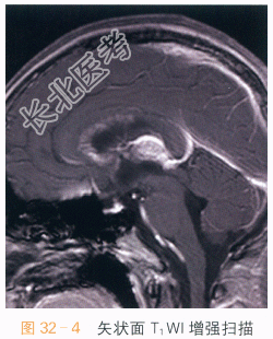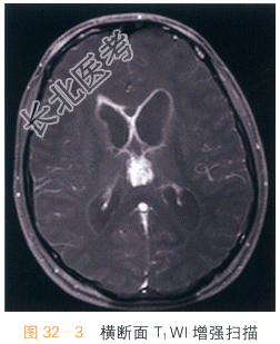 读片分析:头颅横断面T₁WI、T₂WI示松果体区不规则软组织肿块影,呈T₁WI等高、T₂WI低信号影,信号不均匀;横断面、矢状面T₁WI增强扫描可见病灶明显强化,室管膜亦可见明显强化。