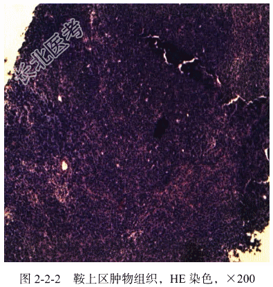 【手术所见】肿瘤质地稀软,血供较丰富,与周围脑组织无明显边界。 【病理所见】肉眼所见:(颅内肿物)不整组织一堆,大小为2.5cm×2.2cm×1cm,呈淡粉色、质中,镜下肿瘤实质主要由类似胚胎神经管原始未分化细胞构成,形似小圆形细胞,呈片状或巢状分布排列,胞核大,胞质少,核质比高,细胞密度高,细胞外含水少,核分裂象易见(图2-2-2)。免疫组化结果:A2:CK(-),Vim(+),GFAP(-),Olig-2(-),TdT(-),Pax5(-),CD3(-),CgA(-),Syn(+),CD56(+),Ki-67(40%+),Des(-),CD20(-),CD99(-)。