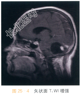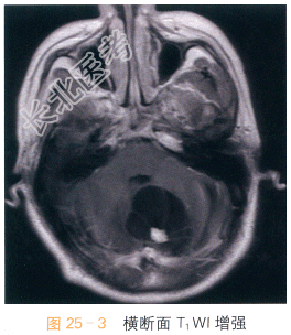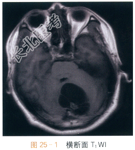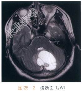 读片分析:头颅横断面T₁WI示小脑半球囊性占位,呈低信号影,边界清晰,边缘光整,内可见附壁结节,呈等低信号影,第四脑室受压改变;横断面T₂WI囊液呈脑脊液样高信号影;增强扫描可见附壁结节明显强化。结合病史,患者考虑为血管母细胞瘤。