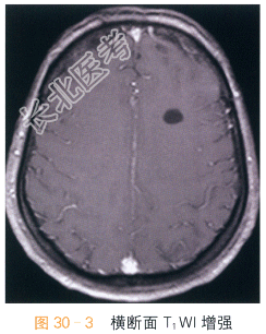 读片分析:头颅横断面T₁WI,T₂WI显示左侧额叶均匀的长T₁WI,长T₂WI信号,边界清晰,周围脑实质未见水肿;横断面、矢状面T₁W增强显示左侧额叶病灶未见明显强化。结合病史,患者考虑为神经上皮囊肿。