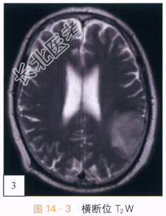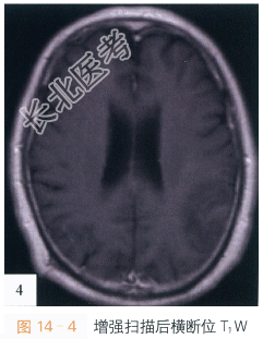 读片分析:头颅CT平扫,如图14-1所示,横断位示左颞叶见类圆形等高密度病灶,密度均匀、边界清楚,周围无明显水肿带,肿瘤临近蛛网膜下腔无增宽,脑沟脑回无受压或移位;头颅横断位MRI T₁W像,如图14-2,左颞叶类圆形低信号肿块影,内部信号稍欠均匀;邻近蛛网膜下腔无增宽,脑沟及脑回无明显受压移位;横断位T₂W像,如图14-3所示,肿块呈等高信号影,内部信号略不均匀,无明显囊变坏死及出血;增强扫描后横断位T₁W像,如图14-4所示,病灶强化稍欠均匀;病灶中必可见少许斑片状异常强化,余无明显异常强化,无脑膜尾征。