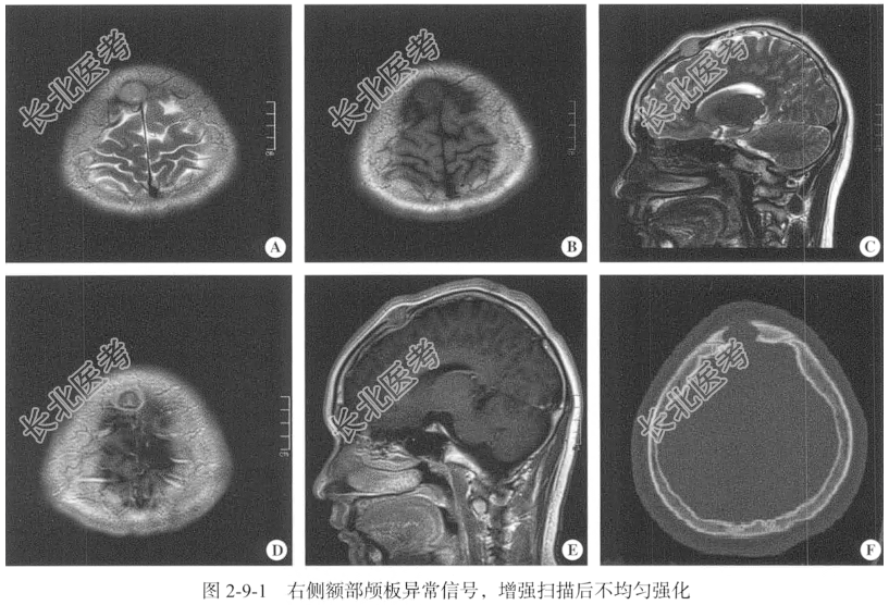 【头颅MRI检查】仰卧位,横断位扫描,包括T₁WI、T₂WI及T₂WI FLAIR序列,扫描范围自小脑半球至颅顶以下,扫描层厚为6mm,层间隔0.5mm,矩阵256×512;辅以矢状位T₂WI序列,平扫后行横断位、冠状位及矢状位的增强扫描。