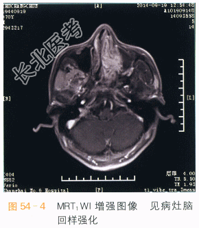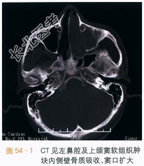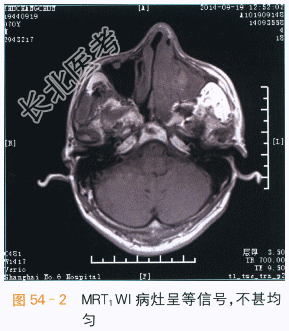 读片分析:鼻腔内翻性乳头状瘤的发生与鼻的黏膜浆液性腺体内管道系统鳞状细胞化生有关,在组织学上虽属良性,但瘤体局部具有浸润性。男女比侧为(2~4):1,高发年龄50~70岁,单侧发病多见。 内翻乳头状瘤的影像表现具有一定的特征性,在CT或MR成像上可见病灶在从鼻腔伸入网侧副鼻窦。在MRI检查可见多呈分叶状,边界清楚。CT检查可见相邻的副鼻窦骨质吸收,如图54-1所示,若骨质有破坏时提示恶变可能。与邻近肌肉比较,病灶T₁WI多呈等、稍低信号,T₂WI多呈不均匀稍高信号,如图54-2、图54-3所示,增强扫描多为明显不均匀强化,有时可见到局部有栅栏状或脑回状表现,如图54-4所示。