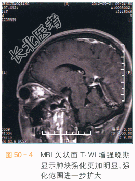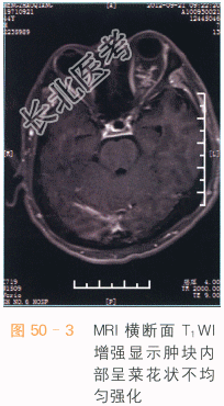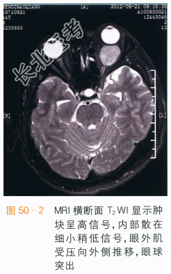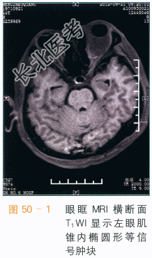 读片分析:眼眶内有肌锥内间隙、肌锥外间隙、骨膜下间隙和巩膜周围间隙等。肌锥内间隙由肌锥围成,主要为脂肪充填,内有视神经通过。肌锥外间隙指肌锥与眶骨膜之间的间隙,主要为脂肪充填。骨膜下间隙指眶骨膜与眶骨之间的潜在间隙,常见病变包括骨膜下血肿、炎症、转移瘤、脑膜瘤等。巩膜周围间隙指Tenon囊与眼球壁巩膜之间的潜在间隙,常见病变包括出血、炎症和眼球内恶性肿瘤侵犯等。肌锥内间隙,是血管源性肿瘤及神经源性肿瘤的好发部位,前界为眼球筋膜及眶膜,周围以眼外肌和肌筋膜为界,呈锥形。 眼眶海绵状血管瘤CT表现为肌锥内类圆形边界清楚之占位,软组织密度,可见结节状钙化,注入造影剂后,呈渐进性强化,为该病的特征表现。肿块占位效应较轻,肿块较大时眼外肌受压向外侧移位,眼球向前方突出。MRI检查时,病灶的T₁WI信号和肌肉类似如图50-1所示,若有血栓形成,可表现为不规则高信号,T₂WI呈类圆形高信号,内偶可见细小低信号分隔,周围假包膜呈低信号,通常没有囊变或坏死如图50-2所示。MRI多平面扫描可以清晰显示肿块的边界,其与视神经、眼球、眼外肌分界清楚,见渐进性强化如图50-3、图50-4所示。