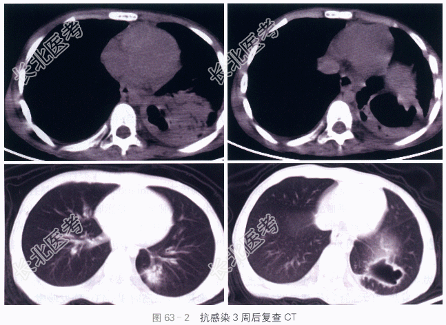 读片分析:CT示:左肺下叶大片实变影,内部肺纹理模糊不清,可见少量支气管充气影,背段及后基底段可见两个类圆形空洞形成,空洞壁较厚,厚度均匀,内壁较光整,后基底段空洞底部见少量液平,未见明显结节及肿块影,外壁不清;所见肺门及纵隔淋巴结无明显肿大;左侧胸腔少量积液。抗感染3周后复查,示左肺下叶大片实变影吸收、消散,下叶背段较小的空洞影闭合、消失,局部仅见少量渗出影及少许纤维条索;后基底段空洞较3周前缩小,空洞壁变薄,周围见少量纤维条索,局部可见少量胸膜增厚及粘连影。