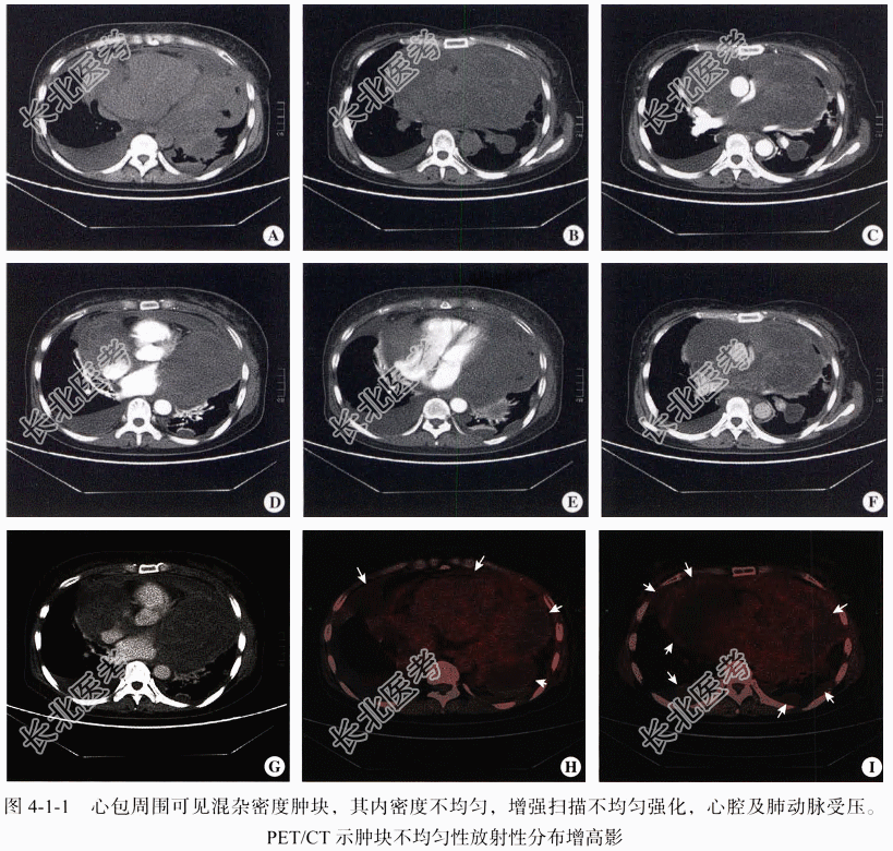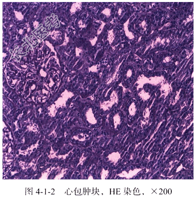 【手术所见】穿刺活检。 【病理所见】(心包肿块)结合免疫组化及肿瘤细胞形态,符合滑膜肉瘤(图4-1-2)。免疫组化结果:CD34(血管+)、Bcl-2(部分+)、STAT6(-)、Ki-67(305+)、SMA(-)、CD99(部分+)、S-100(-)、Desmin(-)、Calponin(+)、EMA(局灶+)、WT1(-)、Myogenin(-)、MyoD1(-);补:AE1/AE3(散在+)、CAM5.2(-)、TLE1(+)、E-cadherin(+)。