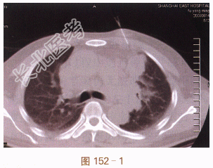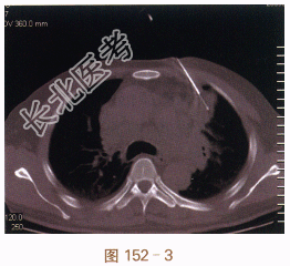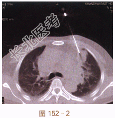 常规CT扫描定位(见图152-1),注射器针头扫描确认位置与进针角度。穿刺活检针达病灶边缘,再次扫描确认位置与角度(见图152-2)。行切割活检,取出病理组织(见图152-3)。
