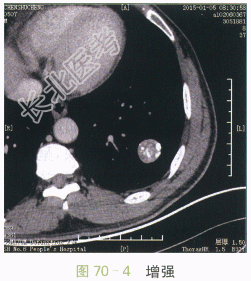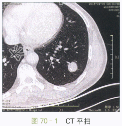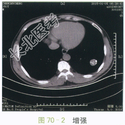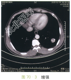 图70-1~图70-4胸部CT平扫与增强:左肺下叶类圆形肿块,边缘光滑,瘤灶内斑点状钙化,呈爆米花样改变,增强扫描未见明显强化 读片分析:CT表现:左肺下叶类圆形肿块,直径约2.7cm,边缘光滑清楚,瘤灶内见多发的小斑片状钙化,呈爆米花样改变,增强扫描未见明显强化。