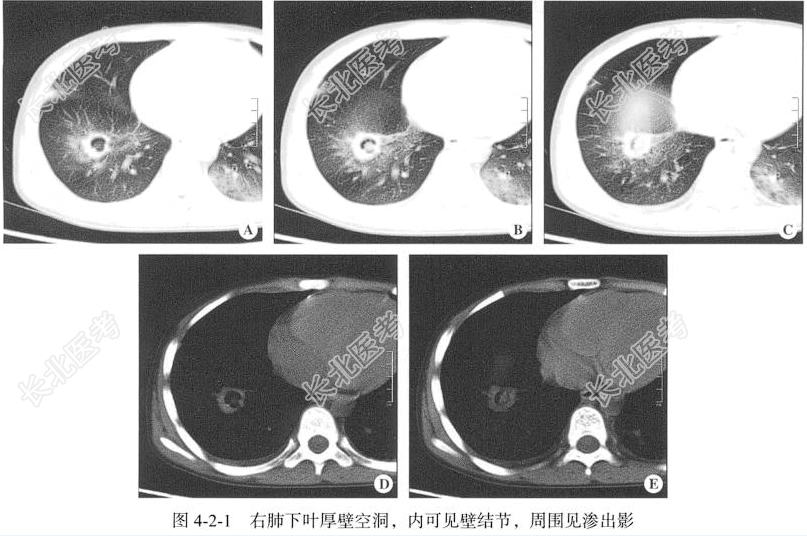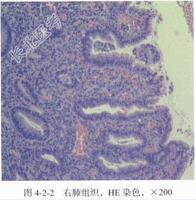 【手术所见】气管及支气管黏膜广泛充血,水肿,黏膜表面粗糙糜烂,触之易出血,表面广泛附着有灰白色豆渣样坏死物,管壁多处见肉芽组织增生。 【病理所见】肺的结节样病灶为干酪样坏死灶,坏死区中央可见大量有隔分枝的菌丝样菌体,呈浅蓝色的空隙样,干酪样坏死物中混有破裂的细胞核和一些红细胞、淋巴细胞及单核细胞(图4-2-2)。