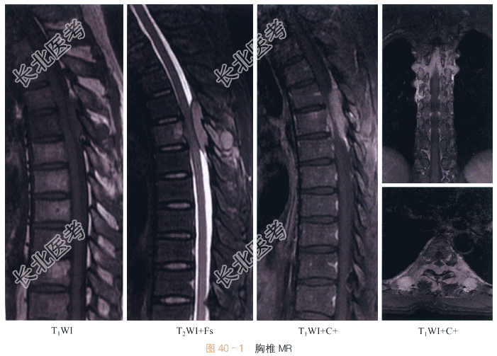 (2)体格检查:胸背部棘突及椎旁压痛及叩击痛,不伴有双下肢放射性疼痛。剑突平面以下皮肤触痛觉减退,双侧膝反射(++++),双侧跟腱反射(++++)。双侧髌阵挛(+),踝阵挛(+)。