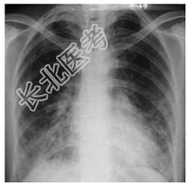 - [材料题] 患者,男性,55岁。咳嗽、发热1周入院。查体:体温,38.1℃;双肺呼吸音粗,双下肺可闻及细湿啰音。心脏听诊无异常。行胸部正位片检查。