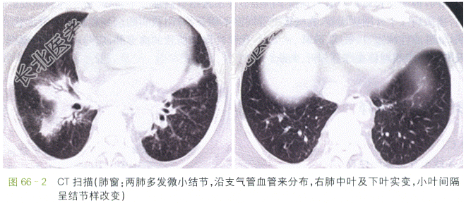 读片分析:X线平片:两肺纹理增多、紊乱、模糊,两侧肺门影明显增大、增浓,边缘模糊,纵隔影增宽。 CT扫描肺窗示两肺门增大,肺门旁纹理结构紊乱,可见多个微小点状致密影,沿支气管血管束分布的增厚片状影,叶间裂下明显,可见少量纤维条索。纵隔窗示纵隔内、血管气管旁见大量肿大淋巴结,两侧肺门肿大的淋巴结呈对称分布;增强后可见淋巴结均匀强化,部分可见融合,邻近组织结构受压、移位。
