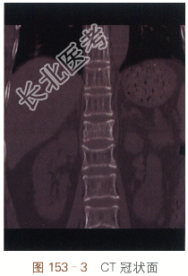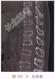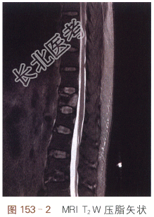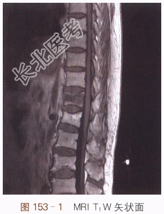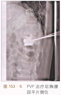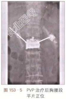 治疗前MRI检查矢状面T₁W(见图153-1);治疗前MRI矢状面T₂WSTIR;MRI(见图153-2)示T₁₂、L₁椎体变扁,T₁₂椎体内见斑片状骨髓水肿,T₁W呈低信号,T₂WSTIR呈高信号,提示为新鲜骨折,L₁椎体骨质信号正常,提示为陈旧性压缩性骨折;治疗前胸腰段CT扫描(见图153-3)冠状面重建;治疗前胸腰段CT(见图153-4)矢状面重建;治疗前胸腰段CT平扫冠状面及矢状面显示胸腰段诸椎体骨皮质变薄,骨小梁稀释,T₁₂、L₁椎体变扁,T₁₂椎体前缘骨皮质不连续,部分骨小梁结构紊乱。PVP治疗后胸腰段平片正位像(见图153-5);PVP治疗后胸腰段平片侧位像(见图153-6);双针法PVP术后,椎体高度有所增加,骨水泥分布良好,邻近椎间盘可见少许骨水泥渗漏。