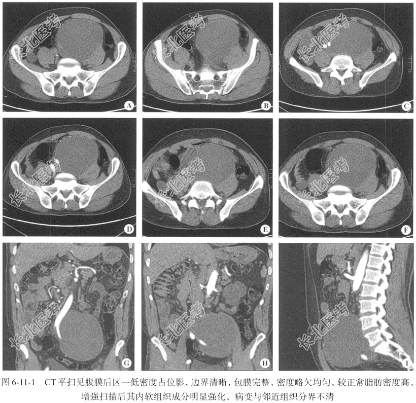 【手术所见】腹膜后见一巨大占位,呈球形,包膜完整,张力较大,目测直径为12~15cm,病灶邻近的血管、肠管及脂肪组织呈受压改变,病灶后方与左侧腰大肌分界不清,周围结构略紊乱,呈炎性渗出改变,切除病灶,包膜内见大量果冻样坏死组织,术中切除大部分瘤体,连同病灶包膜一并切除,送快速冰冻病理检查。 【病理所见】(腹膜后肿物)不整组织一块,大小约12cm×8cm×6cm,包膜完整,表面呈灰红色,切面呈灰黄色、灰白色,质韧。镜下所见如图6-11-2所示。免疫组化结果:CK(-),Vim(+),ER(-),PK(+),S-100(-),CD117(-),Dog-1(-),Desmin(灶+),SMA(+),h-Caldsmon(-),Ki-67(40%+),MyoD1(-),CD34(-),STAT6(-)。
