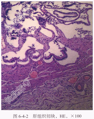【手术所见】肝脏大小、形态未见明显异常,在充分游离肝脏后,肝左叶内可见一占位灶,侵犯第一肝门,胆道可能受侵,大小约为7cm×7cm,与胆囊粘连,胆囊与周围网膜及肠管粘连,以电刀及CUSA刀仔细切除肝脏病变部分,送检后提示交界性肿瘤。 【病理所见】(肝方叶占位)结合免疫组化结果及肿瘤细胞形态,符合血管周上皮样细胞肿瘤,伴有胆固醇结晶形成(图6-4-2)。免疫组化结果:CK8(-)、CK18(-)、CK19(-)、Hepa(-)、Vin(+)、HmB45(+)、S-100(+)、A103(+),SMA(-)、Des(-)、CD117(-)、Ki-67(10%+)、CD34(-)、TFE3(-)、CD31(局灶+)、CD163(-)、CD68(组织细胞+)。
