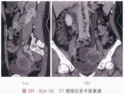读片分析:左侧附件区囊实性不规则形肿块,CT增强后实性部分的边缘呈明显强化,中心坏死部分强化不明显,未见肿大淋巴结和腹水征象。多平面重建后可见,左输尿管下段后累及,其中上段积水扩张。