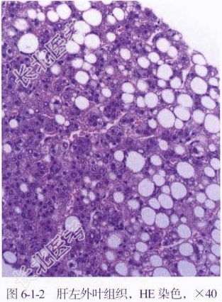 【手术所见】(肝左外叶)不整肝组织1块,大小为11cm×11cm×5.2cm,包膜完整,表面呈灰褐色,肝断端可见灰黄区,大小为8cm×6.5cm×4cm。(肝右叶6段)不整肝组织1块,大小为12.5cm×9cm×6.8cm,表面灰褐色部分附包膜,临床已部分切开。另见不整肝组织1块,大小为10.5cm×8cm×3.5cm,表面呈灰红、灰褐色,切面呈灰红、灰褐色,可见散在灰黄色结节,直径为0.5~0.7cm。(尾状叶)不整肝组织2块,大小为6.2cm×6cm×3.5cm,表面呈灰褐色,部分附包膜,切面呈灰褐色,质中,可见散在灰黄色结节,直径为0.4~1.2cm。 【病理所见】(肝左外叶)切面呈灰黄、灰红色,质中,相连肝组织切面可见散在灰黄色结节,直径为0.4~1.2cm,周围肝脏灰红色,质中,肝细胞排列紊乱,呈结节状,部分区域见纤维组织增生和大量脂肪细胞(图6-1-2);(肝右叶6段)切面见一灰红色区,质软,大小为5cm×4.5cm×4cm,余切面可见散在灰黄色结节,大小为0.2~1cm,局灶血管扩张、充血,灶区组织梗死。