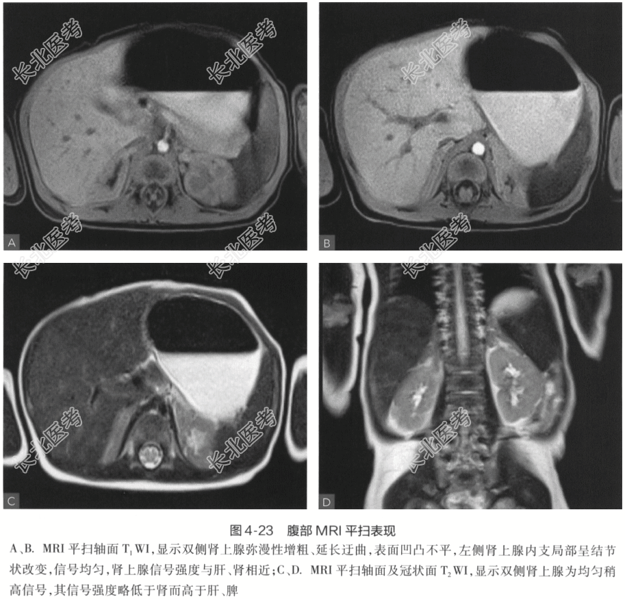 - [材料题] 患者,男,20天。拒乳、体重不增10天。现病史:生后发现全身皮肤发黑,以阴囊处明显,毛发浓密。实验室检查:钾(K⁺)7.51mmol/L;钠(Na⁺)123.88mmol/L;氯(CI⁻)94.20mmol/L;促肾上腺皮质激素(ACTH)64.3pg/ml;血17-羟基孕酮>25ng/ml。垂体MRI检查未见异常。影像学检查: