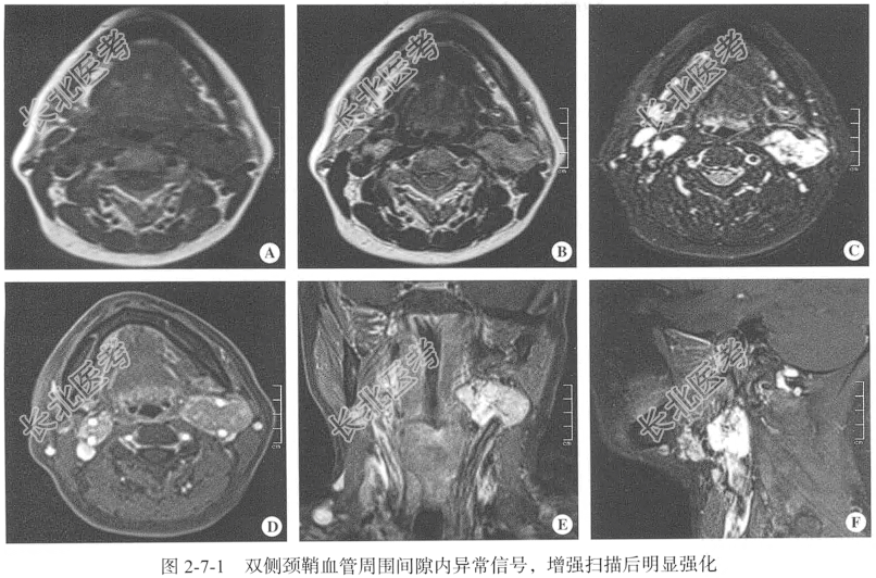 【颈部MRI检查】仰卧位,横断位扫描,包括T₁WI、T₂WI及T₂脂肪抑制序列,扫描范围:寰椎至第5颈椎椎体间,扫描层厚为3.0mm;辅以矢状位T₂WI、冠状位T₂脂肪抑制序列平扫后行横断位、冠状位及矢状位增强扫描。