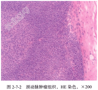 【手术所见】因双侧同时手术风险极大,建议先行较大的左侧肿物切除术,待术后恢复再行对侧手术。左侧肿物切除术发现左侧颈总动脉分叉处肿物,瘤体大小约为5.0cm×4.0cm,实性,血供丰富,伴有搏动,挤压后缩小,放松后立即恢复,分叉处已被瘤体包绕,瘤体上方少许组织较软,余组织及基底部较硬,考虑混合型;右侧肿物切除术从颈总动脉下方分叉处游离,发现分叉处3.0cm瘤体,瘤体紧贴颈内动脉及颈外动脉,瘤体与颈内动脉、颈外动脉粘连致密,瘤体上方少许组织较软,余组织及基底部较硬,考虑为混合型。 【病理所见】(颈部肿物)左侧:结节样物一枚,大小约为3.5cm×3cm×2cm,呈淡粉色,质中;右侧:结节一个,大小约为1.5cm×1.2cm×0.6cm,呈灰红色,质中,全。镜下可见肿瘤细胞呈条索状生长,血窦丰富,瘤细胞胞质丰富,核呈圆形、椭圆形,核分裂象罕见(图2-7-2)。免疫组化结果A1:CgA(+),Syn(+),NSE(+),CD56(+),CK(-),Vimentin(+),EMA(-),GFAP(支持细胞少+),S-100(支持细胞+),MSA(-),Ki-67(2%+)。