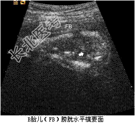 - [材料题] 孕妇,30岁,孕2产0孕22周。超声(孕12周):宫内妊娠,单绒毛膜囊双羊膜囊双活胎,A胎儿NT0.32cm,B胎儿NT0.12cm。孕22周复查超声如下图。
