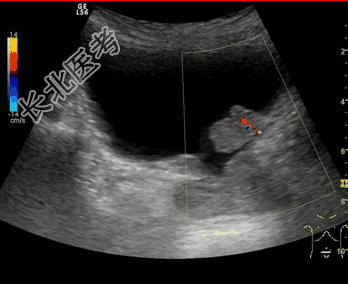 - [材料题] 患者男,72岁,因“无痛性血尿2周”来诊。超声(见下图):膀胱三角区低回声区,约20 mm×25 mm,不随体位改变而移位,形态欠规则,低回声区内见点状血流信号,基底附着处膀胱壁肌层显示不清,但外界膜显示尚清晰,膀胱充盈时肿物不向外膨出。