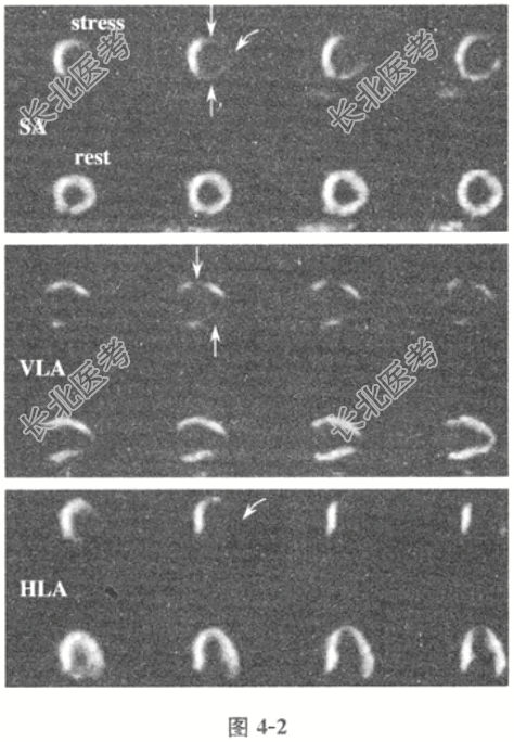 - [材料题] 71岁男性,冠心病病史,持续性心绞痛。¹³N-NH₃PET心肌灌注静息(rest)显像,双嘧达莫药物负荷显像(stresstest)见图4-2。