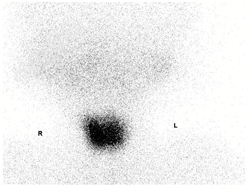 - [材料题] 3岁男童,行⁹⁹TcᵐO₄⁻甲状腺静态显像如图: