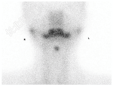 - [材料题] 女性,12岁,发现颈部正中无痛性包块1年,行⁹⁹TcᵐO₄⁻甲状腺显像如图。