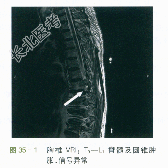 (3)影像学检查:①心电图:窦性心律,ST抬高(可能是早期复极)。②胸椎MRI:T₉-L₁脊髓及圆锥肿胀、信号异常,脊髓炎并出血可能,如图35-1所示;胸椎略向后突,T₉-T₁₂椎体变扁,T₁₂轻度楔形变;胸椎体信号欠均匀,脂肪信号可能;胸椎退行性改变。腰骶椎MRI:下胸段脊髓及脊髓圆锥肿胀伴信号异常,脊髓炎并出血可能,如图35-2所示;L₄-L₅椎间盘膨出;L₅-S₁椎间盘突出;腰椎退行性改变,椎体信号不均匀,L₄-L₅终板炎。