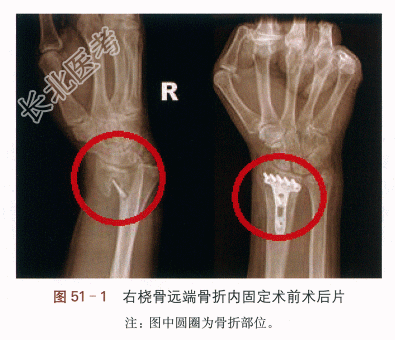 患者,男性,81岁,因“右桡骨远端骨折术后1天”康复早期介入治疗。患者2天前前仆跌倒,右手背触地,致右腕剧烈疼痛伴活动受限,当时无头晕、恶心、呕吐等症状,急至医院就诊,右腕关节X线示:右桡骨远端粉碎性骨折,累及关节面,如图51-1所示。于1天前行右桡骨骨折切开复位内固定手术。目前术后20h,患者神清、精神可,支具固定腕关节于中立位,右腕关节可轻度屈伸,尺偏、桡偏受限,右腕关节肿胀疼痛,掌指、指间关节活动时腕关节处不适加重,康复早期介入治疗。