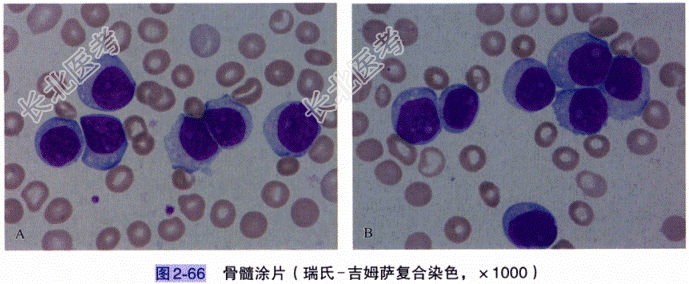 - [材料题] 患者,男,74岁。主因“白细胞增高1⁺年,发热伴尿频、尿急、尿痛1⁺周”就诊。门诊查血常规:WBC78.5×10⁹/L,中性粒细胞百分比3.0%,淋巴细胞百分比30.0%,单核细胞百分比0.0%,RBC3.16×10¹²/L,Hb100g/L,PLT91×10⁹/L;外周血涂片显示原幼细胞占67.0%,遂以“急性白血病”收住血液内科。体格检查 T36.5℃,P86次/分,R20次/分,BP129/73mmHg。慢性病容,神志清楚,全身皮肤、黏膜稍苍白,无皮疹及出血点,舌苔白厚;颈部、腋窝及腹股沟触及多处淋巴结肿大,最大直径约3cm,质韧,无压痛,活动欠佳;双肺呼吸音粗,未闻及干、湿啰音及哮鸣音;心率86次/分,律齐,未闻及杂音;全腹软,未见胃肠型及蠕动波,腹部无压痛,无反跳痛及肌紧张,墨菲征阴性;肝肋下约3cm,质韧,无压痛;脾重度肿大,超脐,质韧,伴轻触痛;肝、肾区无叩击痛,肝、肺相对浊音界存在,移动性浊音阴性,肠鸣音3次/分,未闻及气过水声及高调肠鸣音;双下肢水肿。辅助检查:(1)常规检查:①血常规:WBC78.5×10⁹/L,中性粒细胞百分比3.0%,淋巴细胞百分比20.0%,单核细胞百分比0.0%,RBC3.16×10¹²/L,Hb100g/L,PLT91×10⁹/L,外周血涂片提示原幼细胞占77.0%,超敏C反应蛋白7.89mg/L。②外周血淋巴细胞亚群检测:总T淋巴细胞百分比18.76%,辅助/诱导T淋巴细胞百分比12.32%,抑制/细胞毒T淋巴细胞百分比5.94%,B淋巴细胞百分比78.22%,NK细胞百分比1.34%。③其他检查:腹部、泌尿系统B超提示肝、脾大,腹膜后淋巴结肿大,胆囊增大,胆汁淤滞。胸部CT显示两侧腋窝及纵隔淋巴结增多肿大,脾大。(2)细胞形态学检查:①血象结果:外周血白细胞显著增高,血涂片原幼细胞占77.0%,建议做骨髓细胞形态学检查(图2-65)。②骨髓象结果:骨髓增生极度活跃,粒:红=1:1,粒系、红系极度受抑制,淋巴细胞恶性增生,幼淋巴细胞占95.5%;MPO阴性,PAS呈不同程度阳性,ACP阳性。考虑淋巴系统增殖性肿瘤(幼淋巴细胞白血病可能性大),请结合流式细胞学、细胞遗传学和基因检测结果综合分析(图2-66)。(3)流式细胞学分析:送检标本中可见87.4%的成熟B淋巴细胞,其免疫表型为CD19(+)、CD20(+)、CD22(+)、CD23(+)、CD79a(+)、FMC7(+)、ZAP70(+)、CD38(+),CD5(-)、CD10(-),胞膜免疫球蛋白sIgM表达明显;支持B-PLL。(4)临床诊断:支持幼淋巴细胞白血病(PLL)。