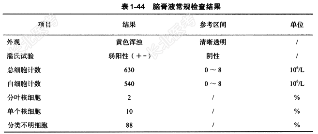 - [材料题] 患者,女,49岁。1年前明确诊断急性髓系白血病(M5a型)伴MLL/AF9突变高危组CR1,并于我院行化疗治疗。3个月前无明显诱因出现双侧颈肩部、双侧上肢疼痛,转颈时左侧上肢牵扯样疼痛,伴双侧上肢麻木感,无发热、咳嗽、咳痰,无心悸、气促及呼吸困难,无腹痛、腹胀等不适,当时患者因在血液内科行化学治疗(简称化疗),会诊后给予保守治疗;后因颈肩部疼痛于疼痛科住院治疗,行局部麻醉后数字减影血管造影(DSA)引导下经皮穿刺行颈椎间盘射频热凝、臭氧消融术,术后疼痛明显缓解后出院。10⁺d前感觉双侧颈肩部疼痛、麻木加重,左侧较右侧明显,并有双手远端指节麻木、持物不牢及灵活性降低。为求进一步诊治入住我院。体格检查 T36.8℃,P59次/分,R19次/分,BP131/63mmHg。全身皮肤黏膜、巩膜无黄染,浅表淋巴结未扪及明显肿大;头颅、五官无畸形,右侧面部肿胀,无明显波动感,局部压痛,张口受限,右下第6颗牙龈稍红肿,无破溃及溢脓等;气管居中,甲状腺未扪及肿大;胸廓双侧对称无畸形,胸廓挤压征阴性,双肺呼吸音稍低,未闻及明显的干、湿啰音;心界不大,律齐,各瓣膜听诊区未闻及明显的病理性杂音;腹平软,无胃肠型及蠕动波,无压痛、反跳痛及肌紧张,肝、脾未触及,移动性浊音阴性,肠鸣音正常。辅助检查:(1)常规检查:见表1-42至表1-44。(2)细胞形态学检查:脑脊液常规检查发现分类不明细胞,离心推片后瑞氏-吉姆萨复合染色(图1-41)如下:该类细胞胞体较正常成熟淋巴细胞偏大,呈圆形或类圆形;胞质很少,核质比高,质呈蓝色;核为圆形或类圆形,核染色质疏松、细致。(3)病理诊断:①左侧颈部肿块,穿刺病理活检提示:恶性肿瘤;②免疫组化提示:CD163(+),CD68(PGM1)(+),MPO(小灶+),CD138(-),CD3(-),CK(-),CK20(-),TdT(-),Ki-67(90%+),CD10(-),CD117(-),CD34(-),CD38(-);Kappa及Lambda无优势表达。结合组织学形态及病史,诊断为急性白血病髓外肉瘤。