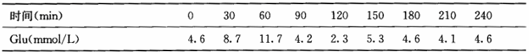 - 简答题1、[提示]考虑到3次发病都在发病日的同一时间,且无癫痫症状,首先怀疑为反应性低血糖症,上午9点左右的随机血糖结果为3.2mmol/L。进一步做延长糖耐量试验,结果如下。