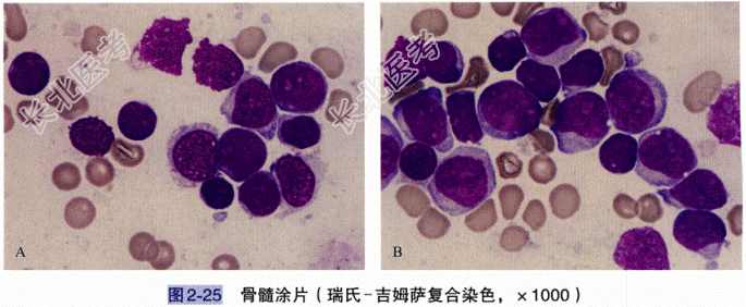 - [材料题] 患者,女,20岁。因“发热、腰部疼痛,伴牙龈、鼻腔出血、全身散在出血点1周”就诊。门诊血常规检测结果:WBC66.95×10⁹/L,中性粒细胞百分比2.1%,淋巴细胞百分比92.3%,单核细胞百分比5.6%,RBC1.72×10¹²/L,Hb76g/L,PLT4×10⁹/L;外周血涂片见大量原始和幼稚细胞,遂以“急性白血病”收住我院血液内科。体格检查 T39.5℃,P109次/分,R26次/分,BP101/59mmHg。神志清楚,发育正常,急性病面容,全身皮肤中度苍白、无黄染,双下肢皮肤见散在出血点和瘀斑,全身浅表淋巴结未触及;双侧瞳孔等大正圆,直径3mm,对光反射存在,右眼底视网膜及黄斑区可见散在出血点;双侧鼻腔未见活动出血,牙龈肿胀,大部分牙龈有渗血;右侧扁桃体Ⅱ度肿大,表面有脓点、软;甲状腺不大,气管居中,颈静脉无怒张;胸骨有明显压痛,胸廓无畸形,双肺呼吸音清,未闻及干、湿啰音,心界不大、心律齐,心率109次/分、心脏各瓣膜未闻及杂音;腹平软,肝、脾肋下侧位可触及,其余部位未扪及肿块;四肢关节未见红肿,生理反射存在,未引出病理神经反射。辅助检查:(1)常规检查:①血常规:WBC66.95×10⁹/L,中性粒细胞百分比2.1%,淋巴细胞百分比92.3%,单核细胞百分比5.6%,RBC1.72×10¹²/L,Hb76g/L,PLT4×10⁹/L;外周血涂片见大量原始和幼稚细胞。②凝血功能:纤维蛋白原4.40g/L(↑)。③尿便常规:粪便未见异常;尿常规RBC(+++),余未见异常。④血液生化:球蛋白31.6g/L(↑),α-羟丁酸脱氢酶212U/L(↑),腺苷脱氨酶64.2U/L(↑),同型半胱氨酸33.14μmol/L(↑),β₂-微球蛋白2.35mg/L(↑);其他检验结果:ESR114mm/h,降钙素原0.01μg/L,hs-CRP74.5mg/L(↑)。(2)细胞形态学检查:①血象结果:原始细胞占85%,建议做骨髓细胞形态学检查(图2-24)。②骨髓象结果:分类原始细胞占92%,该类细胞胞体偏小,胞质量少,染浅蓝色,核圆形,染色质细致疏松,可见2~5个小而清晰的核仁。结合形态学考虑急性白血病,建议做流式细胞学检查以明确分型(图2-25)。③细胞化学染色检查:骨髓过氧化物酶染色,白血病细胞阳性率占2%,考虑急性髓细胞白血病(M1)(图2-26)。(3)骨髓活检:①镜下描述:骨髓增生极度活跃,粒红比不宜评估,原始细胞呈大片状分布,胞体不大,胞核多呈圆形或类圆形,染色质浅染,胞质量偏少;可见少量中、晚幼稚粒细胞,红系少见;巨核细胞未见,淋巴细胞少见,未见纤维增生。②免疫组化:CD34大片(+),CD117大片(+),CD33大片(-),MPO(-),CD3(-),CD10(-),PAX(-)。③骨髓活检分析结果:结合镜下形态和免疫组化,符合急性白血病,请结合骨髓涂片形态、流式细胞学和分子检查明确分型。④流式细胞学分析:在CD45/SSC点图上,可见异常细胞群Blast,占有核细胞的82.07%。主要表达CD34、cMPO,部分表达HLA-DR、CD13、CD64、CD117,弱表达CD15、CD11b(图2-27)。提示急性髓细胞白血病未成熟型(AML-M1),请结合临床表现、细胞形态学和细胞遗传学结果进一步确诊。(4)分子生物学:融合基因BCR-ABL阴性。样本存在肿瘤克隆基因,多个染色体异常。Y、1、2、3、4、5、7、8、9、11、13、17号染色体检测到异常拷贝数。(5)临床诊断:急性髓细胞白血病(M1)。